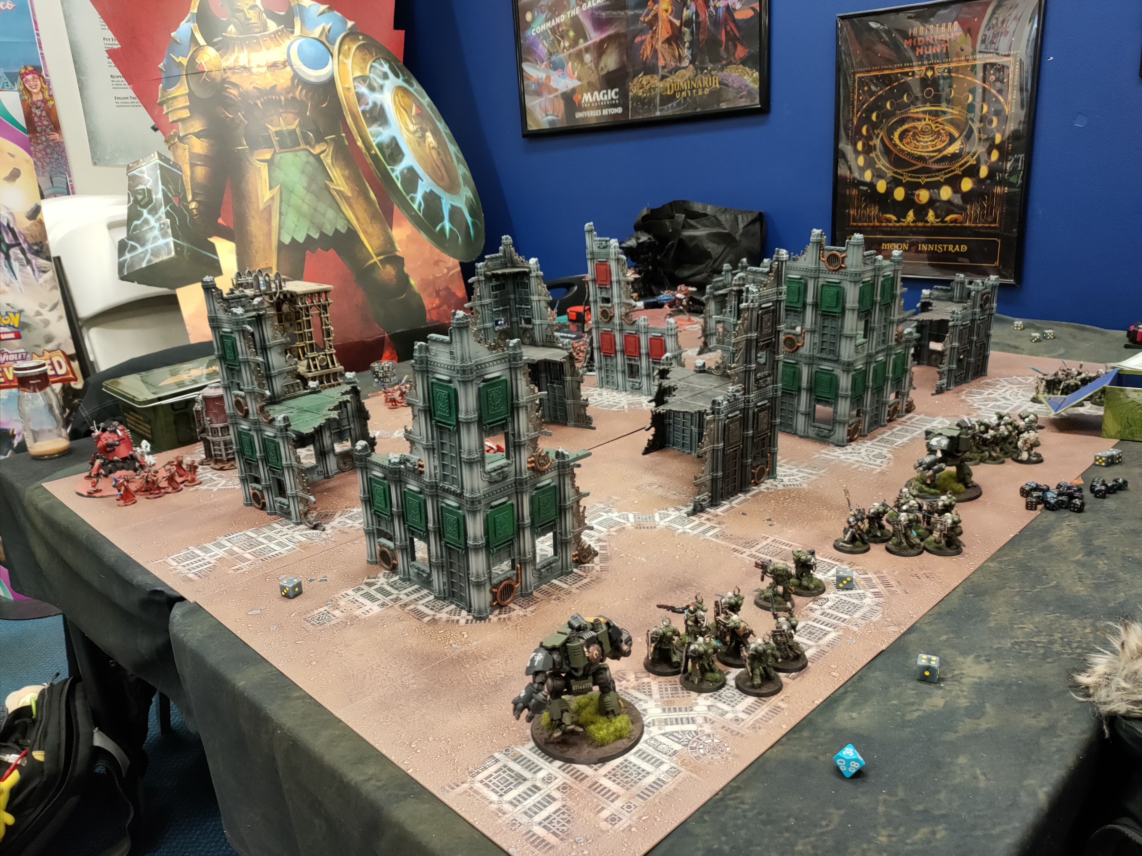 Calculating vectors and trajectories, and transmitting firing solutions through the noosphere, the Hunter Cohort turned upon their Space Marine hunters. The neutron laser spat, but missed, while a Skitarii Ranger's arc rifle sent convlusions through a Redemptor Dreadnought. Meanwhile, 28-Tetsuo's squadron of Ironstrider Ballistarii, supported by an Onager Dunecrawler, fired into the Terminators who had teleported right on the tail-end of the Serberys Sulfurhounds. The Serberys Sulfurhounds turned around to unleash both phosphor rounds and sulfur breaths onto the Terminators, and the combined firepower was enough to bring a couple of the walking tanks down. Meanwhile, the Inceptors were taken down by an Onager Dunecrawler with Icarus array, along with hard rounds from the Skitarii Rangers, who avenged their fallen with galvanic, plasma and transuranium rounds of their own.